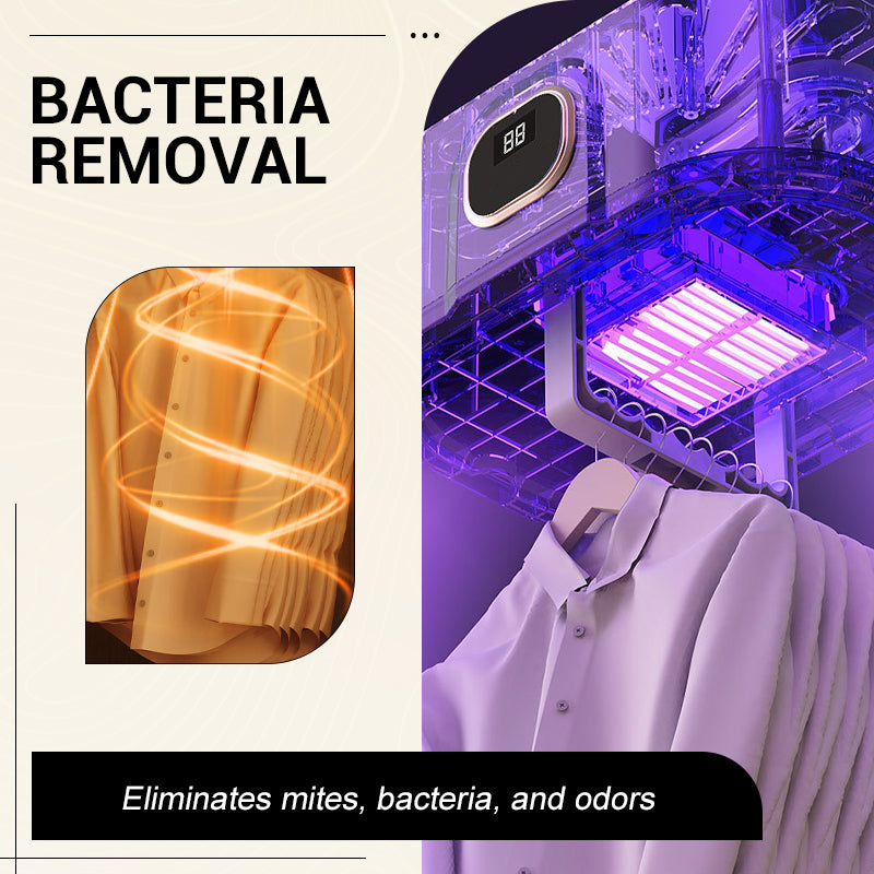 REINIGENDE KRACHT – Het apparaat droogt niet alleen, maar helpt ook om alles schoon te houden. De hete lucht elimineert bacteriën en huisstofmijt, terwijl de ingebouwde negatieve ionentechnologie geurtjes neutraliseert. Dit zorgt ervoor dat uw kleding niet alleen droog is, maar ook hygiënisch veilig en fris ruikt.