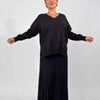 CHIQUE PLISSÉROK – De plissérok heeft een sierlijke drapering die volume toevoegt zonder te veel dikte. Hij past prachtig bij de top met V-hals, accentueert de taille en verlengt het silhouet voor een flatterende, vrouwelijke look die naadloos overgaat van dag naar avond.