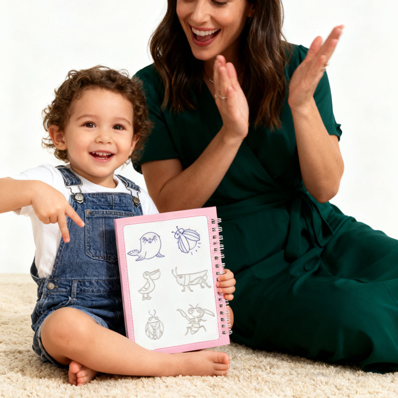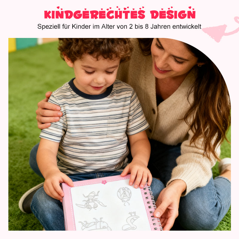 Dank de bijgeleverde magische stift verdwijnen de getekende linien na korte tijd vanzelf. Kinderen kunnen steeds opnieuw oefenen, zonder papier te verspillen – perfect voor duurzaam en continu leren, thuis of in de peuterschool.